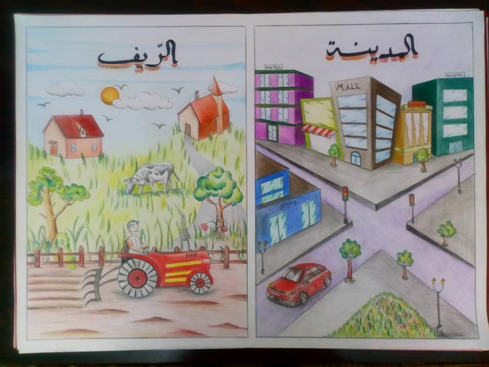 A School Drawing (50x70 cm) showing the difference between the countryside and the modern city.